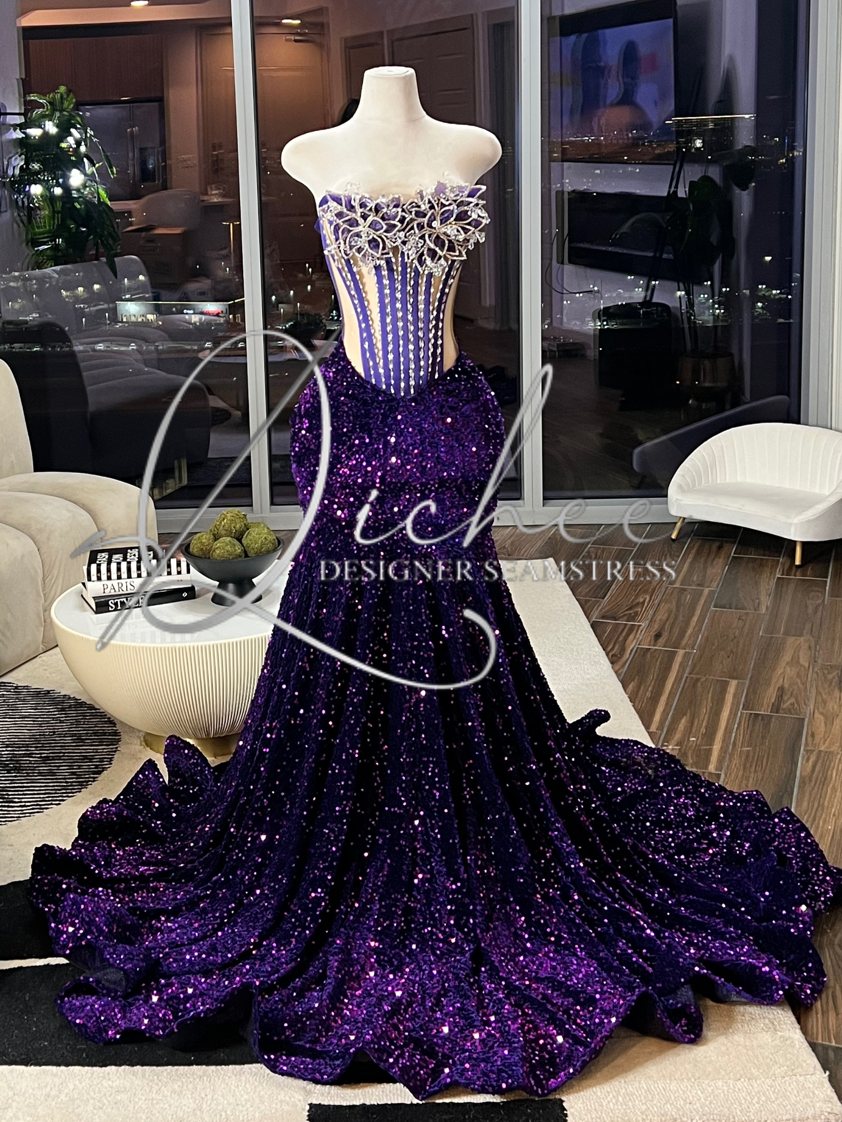 The “Bella of the Ball” gown is a captivating masterpiece designed to turn heads. Featuring a corset bodice adorned with handmade 3D crystal details and a shimmering sequined skirt with a dramatic train, this gown exudes elegance and glamour. Available in vibrant hues, it’s perfect for making a statement at galas, pageants, and special occasions.