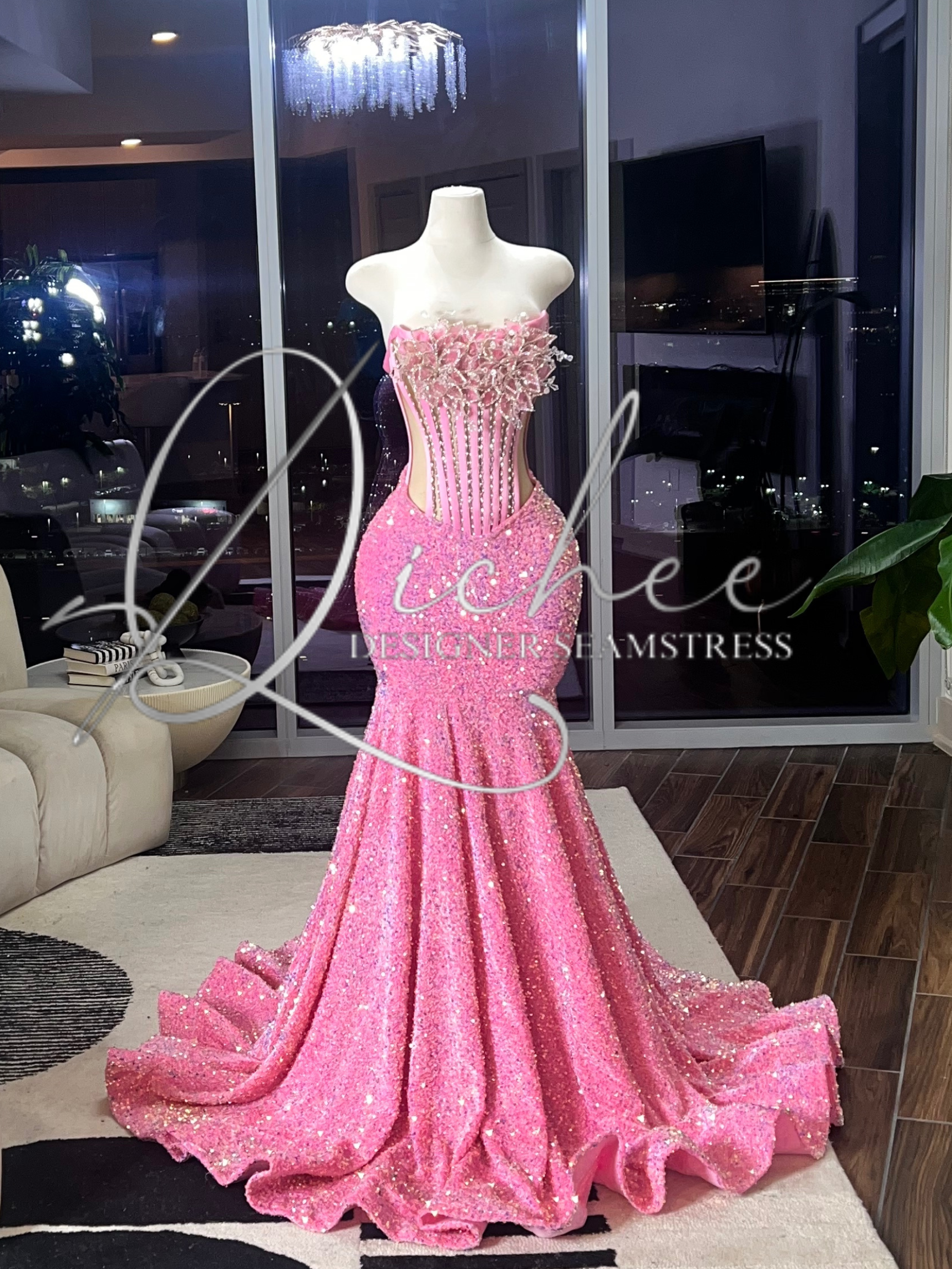 The “Bella of the Ball” gown is a captivating masterpiece designed to turn heads. Featuring a corset bodice adorned with handmade 3D crystal details and a shimmering sequined skirt with a dramatic train, this gown exudes elegance and glamour. Available in vibrant hues, it’s perfect for making a statement at galas, pageants, and special occasions.
