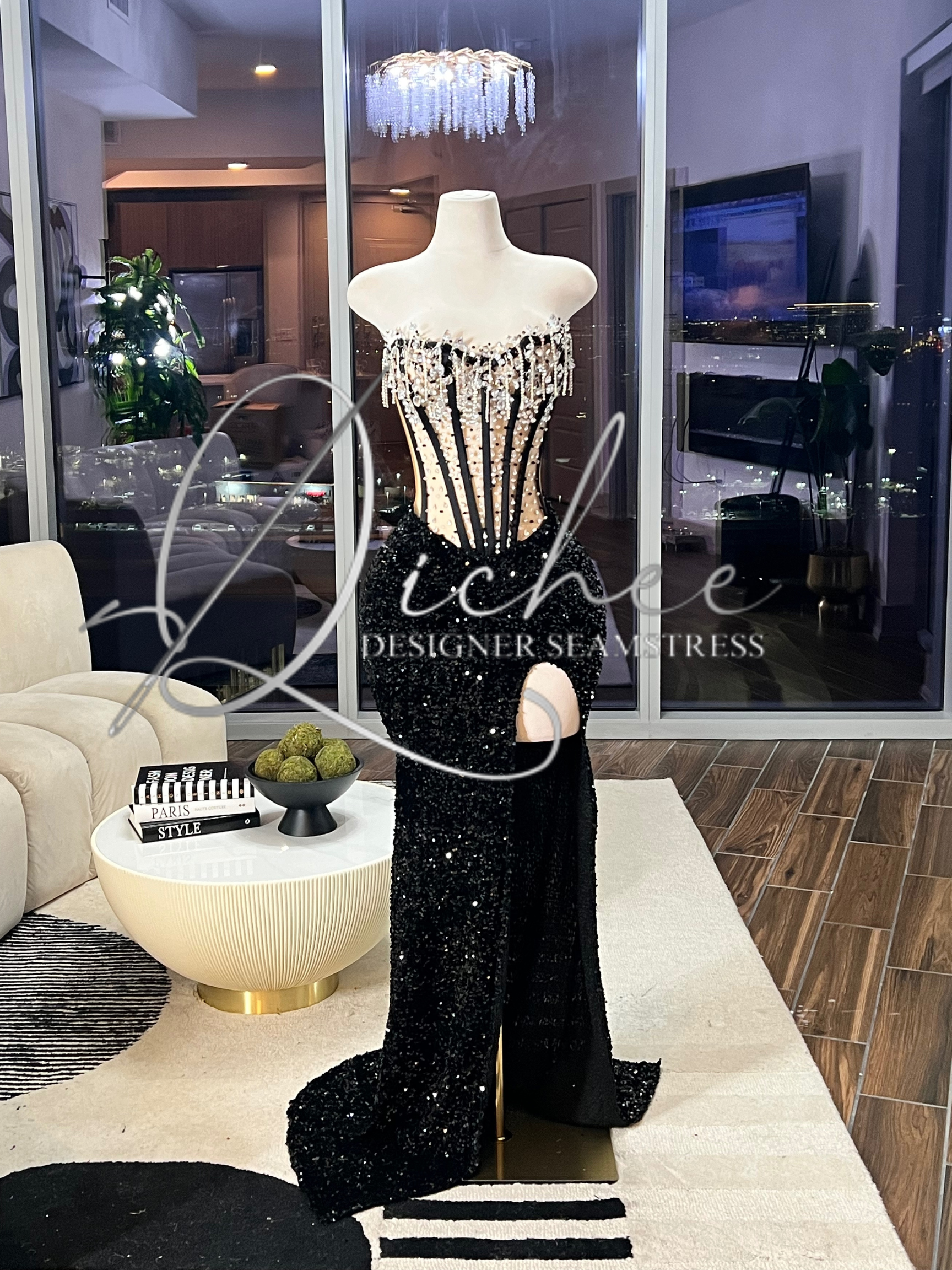 The “Shimmer Split” gown is the epitome of elegance and allure. Designed with a dazzling sequined fabric that sparkles with every step, it features a fitted silhouette that accentuates the figure. The daring thigh-high split adds a touch of drama, while the structured corset bodice, adorned with intricate embellishments, ensures a stunning fit. Perfect for formal events, galas, or any occasion where you want to shine. Available in a range of striking colors to suit your unique style.